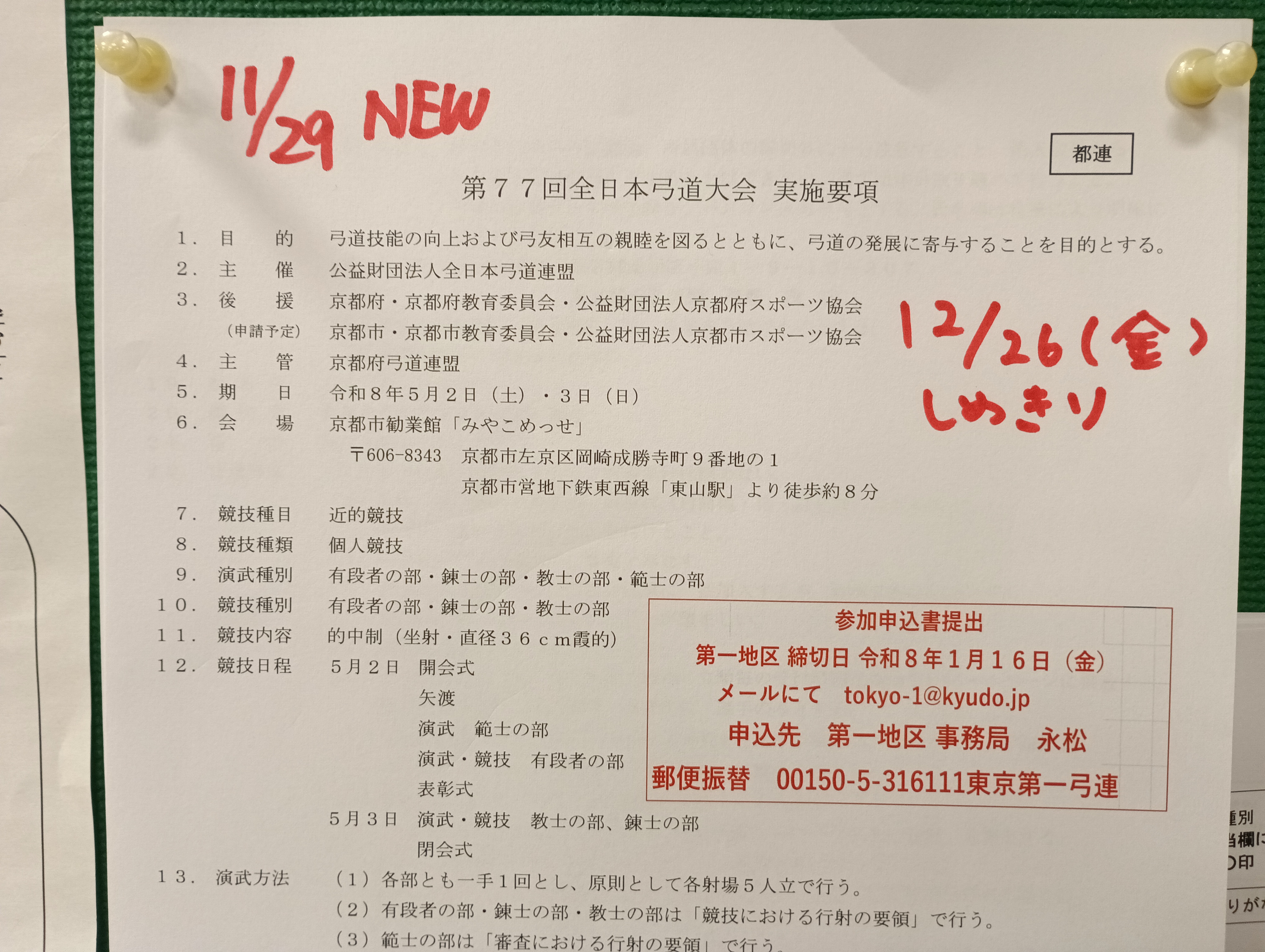 2026年1月18日当道場にて行われる 新年射会の要項を掲示しました。 締切りは12月26日(金)です。 詳しくは道場掲示をご確認ください。 &…