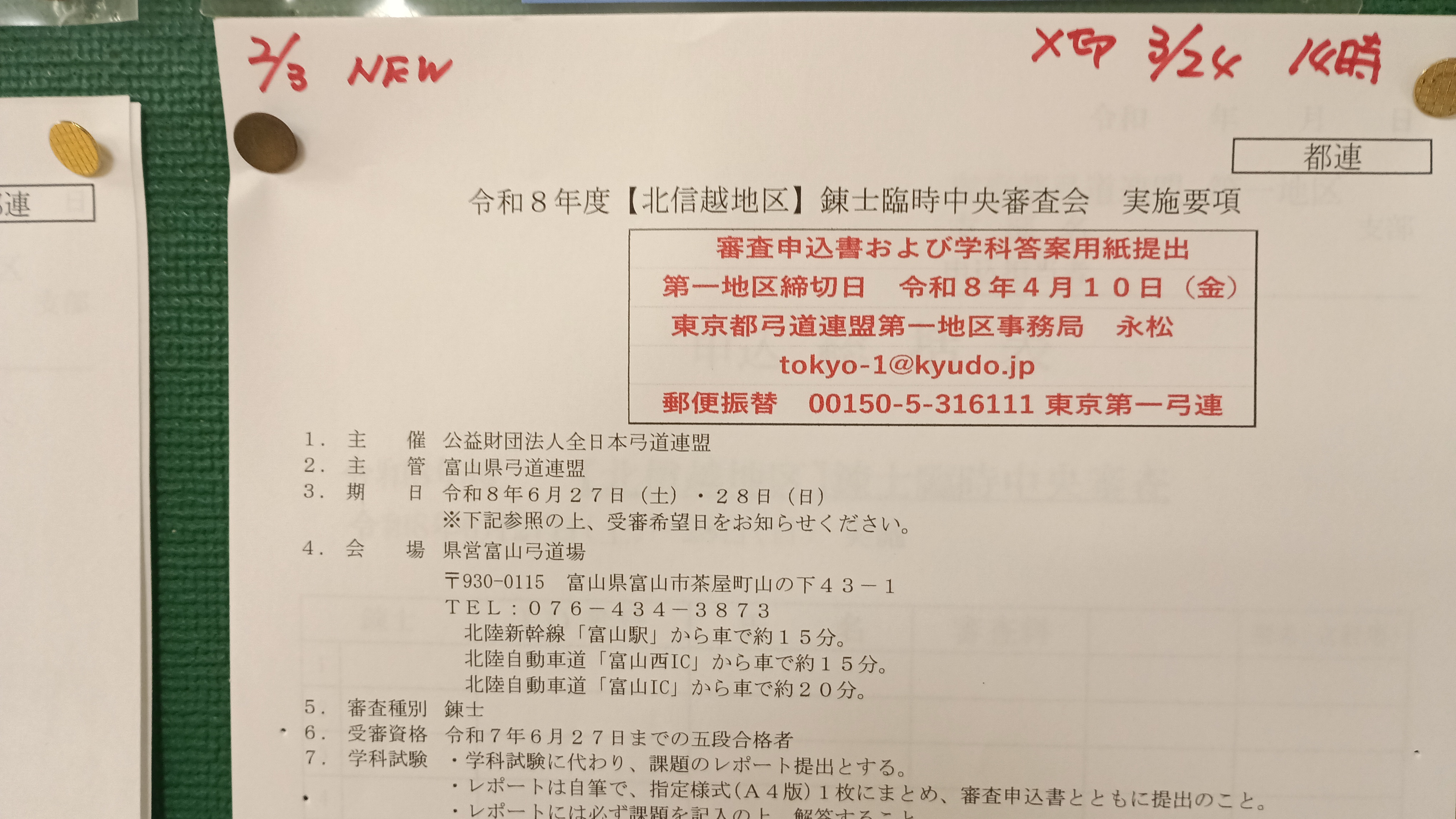 6月27日から富山県にて行われる 錬士臨時中央審査の実施要項を掲示しました。 足立支部締め切りは3/24 14時です。 詳しくは道場掲示をご確認くだ…